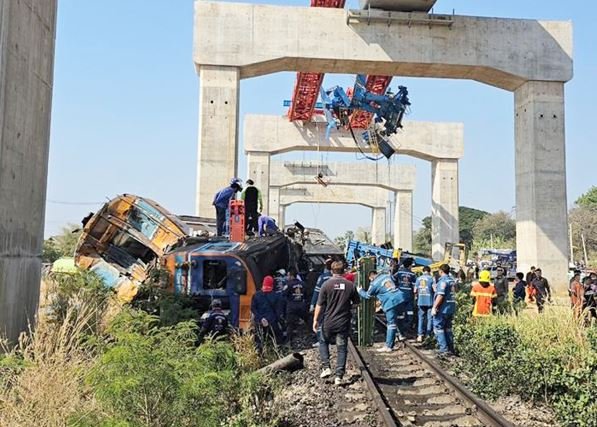 बैंकाक। थाईलैंड के नाखोन रत्चासिमा प्रांत में बुधवार की सुबह एक ह्रदय विदारक रेल दुर्घटना हो गई। जिसमें कम से कम 22 लोगों की दर्दनाक मौत हो गई। यह हादसा उस वक्त हुआ जब बैंकॉक से उत्तर-पूर्वी थाईलैंड की ओर जा रही एक पैसेंजर ट्रेन पर निर्माण कार्य में लगी एक विशाल क्रेन गिर गई। इस टक्कर के कारण ट्रेन के डिब्बे पटरी से उतर गए और मौके पर चीख-पुकार मच गई।